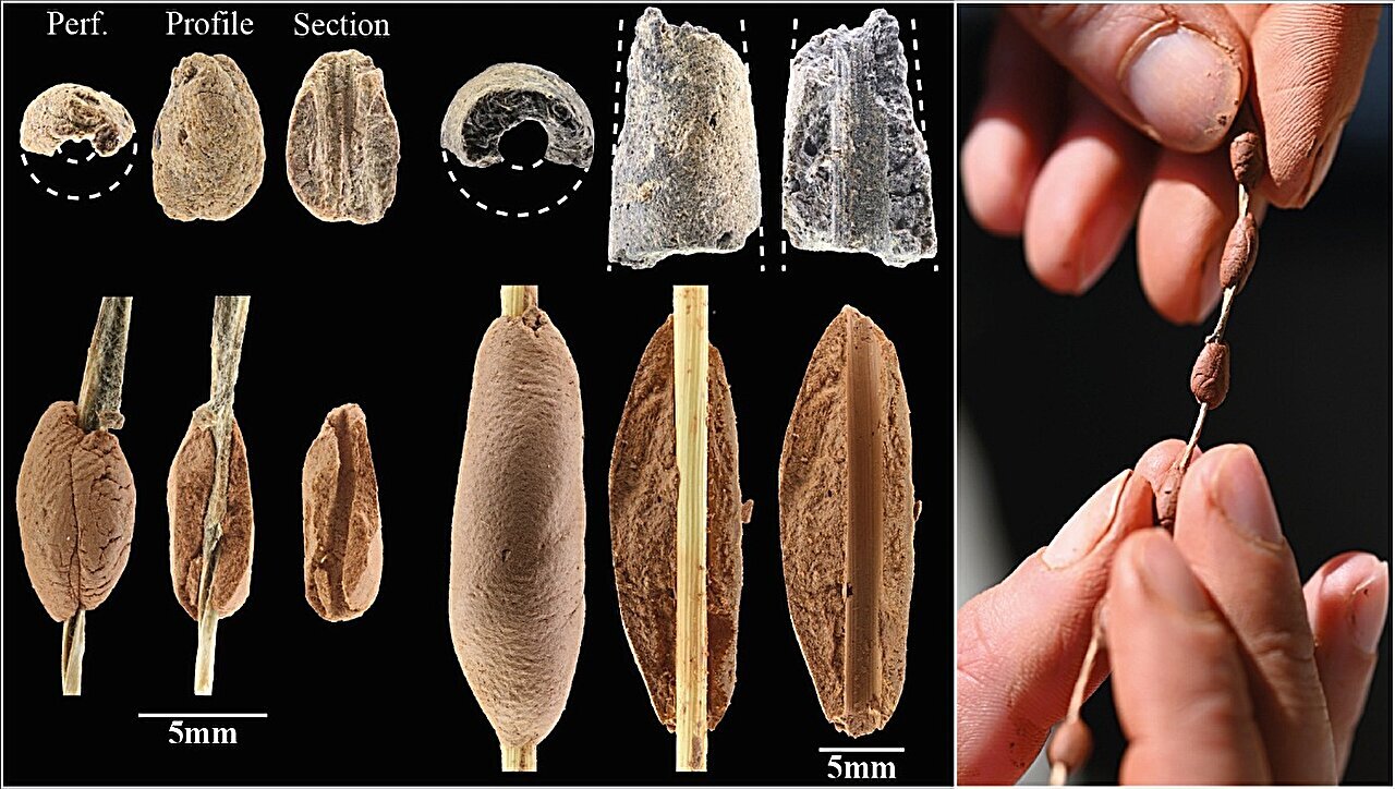 Исследователи выделили 19 типов бусин, многие из которых имитируют формы растений, составлявших основу рациона натуфийцев: дикий ячмень, пшеницу-однозернянку, чечевицу и горох. Те самые культуры, которые спустя тысячелетия станут фундаментом мировой агрокультуры, уже тогда были для людей не просто едой, а источником эстетических смыслов. Следы растительных волокон на некоторых бусинах позволяют реконструировать, как их нанизывали и носили.