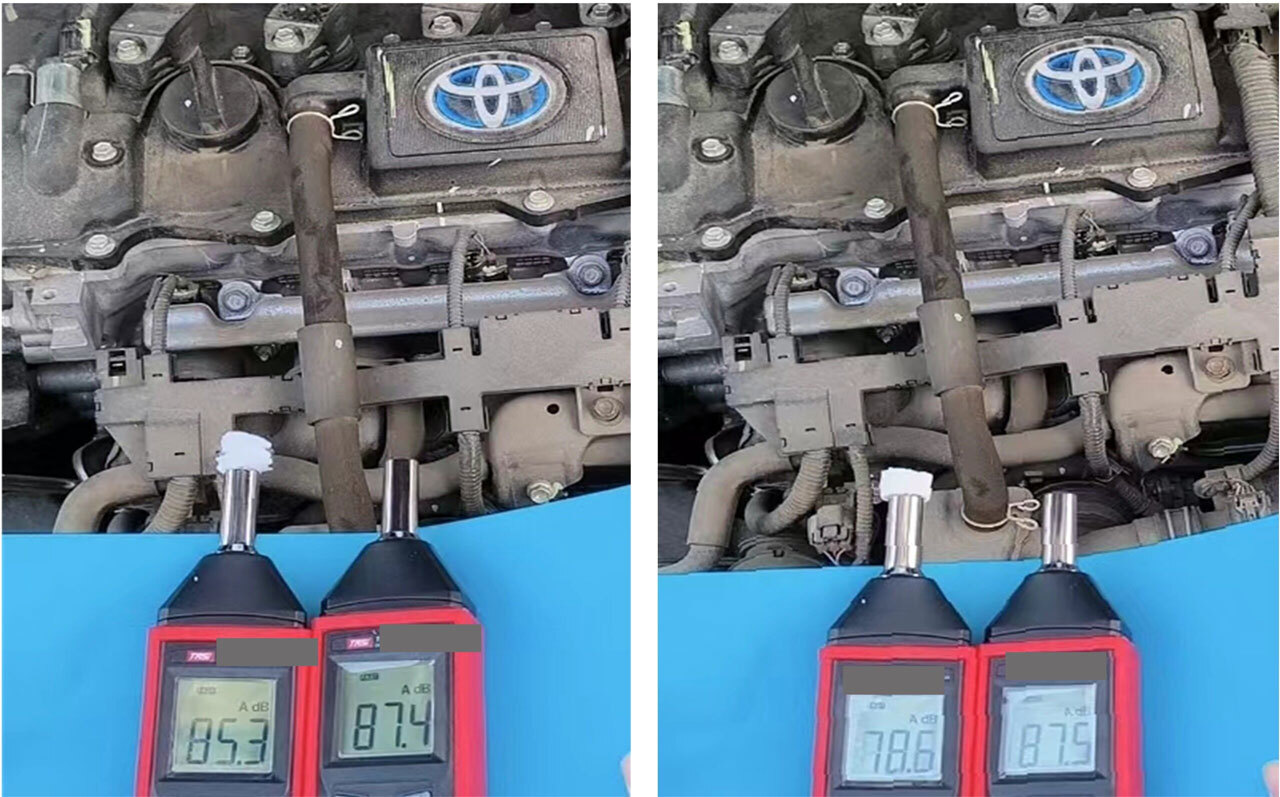 - снижает уровень шума двигателя автомобиля с 87,5 децибел до безопасных 78,6 децибел, что лучше, чем у существующих высококлассных шумопоглотителей,