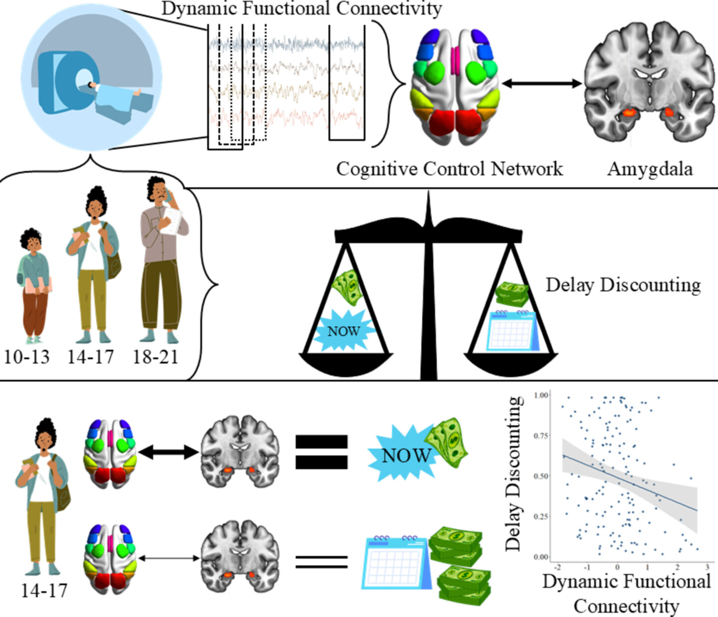 Для изучения мозга использовалась фМРТ (функциональная магнитно-резонансная томография) в состоянии покоя с методом динамической функциональной связи (dFC). Этот подход позволяет проследить, как связь между областями мозга меняется во времени. У старших подростков более сильная и подвижная связь между левой амигдалой и сетью когнитивного контроля предсказывала выбор немедленного вознаграждения при сумме $40 000. Для правой амигдалой такой зависимости не наблюдалось.