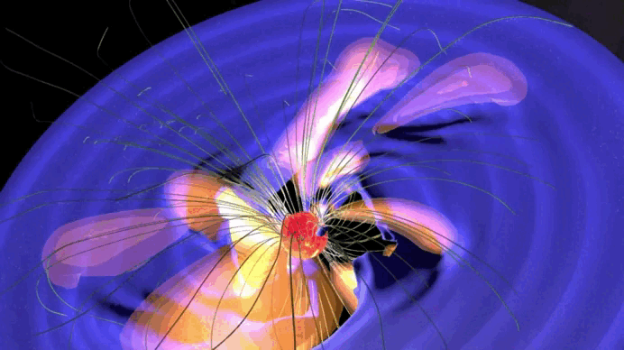 Эта 3D-модель показывает звезду возрастом менее 10 миллионов лет, окруженную диском материала. Этот класс объектов известен как звезды типа T Тельца, названные в честь молодой звезды в области звездообразования Тельца. Модель описывает эффекты множественных вспышек или выбросов, которые обнаружены в рентгеновских лучах от одной звезды типа T Тельца, известной как BP Tau. Эти вспышки взаимодействуют с диском материала и приводят к образованию протяженной внешней атмосферы, состоящей из горячих петель, соединяющих диск с развивающейся звездой.