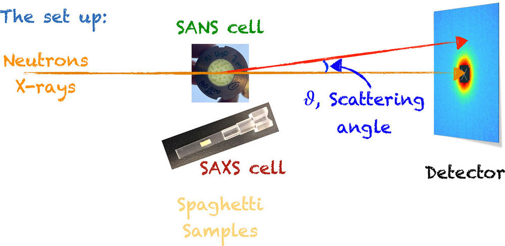 Нейтронные эксперименты проводились в Институте Лауэ-Ланжевена (ILL) в Гренобле и на источнике нейтронов и мюонов ISIS в Великобритании. В обоих случаях малоугловое нейтронное рассеяние (SANS) сочеталось с техниками контрастной вариации: изотопы одного и того же элемента имеют схожие химические свойства, но могут рассеивать нейтроны совершенно по-разному. Это относится к водороду (H) и дейтерию (D). Готовя пасту в различных смесях обычной (H₂O) и тяжелой (D₂O) воды, исследователи могли создавать образцы, каждый из которых выделял определенный интересующий компонент, делая другие невидимыми для нейтронного пучка. Таким образом, они могли разделить влияние варки на крахмал и глютен — два основных компонента обычных макарон.