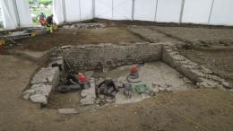 Центральной находкой стала римская дорога шириной около 4 метров, окруженная дренажными канавами и портиками с колоннами с обеих сторон. Инфраструктура указывает на важную магистраль, к которой выходили фасады так называемых полосных домов — узких жилых построек, типичных для римских городов в провинциях. Раскопки выявили подвалы таких домов, а во дворах за ними — выложенные камнем шахты (предположительно уборные или хранилища) и несколько детских захоронений.