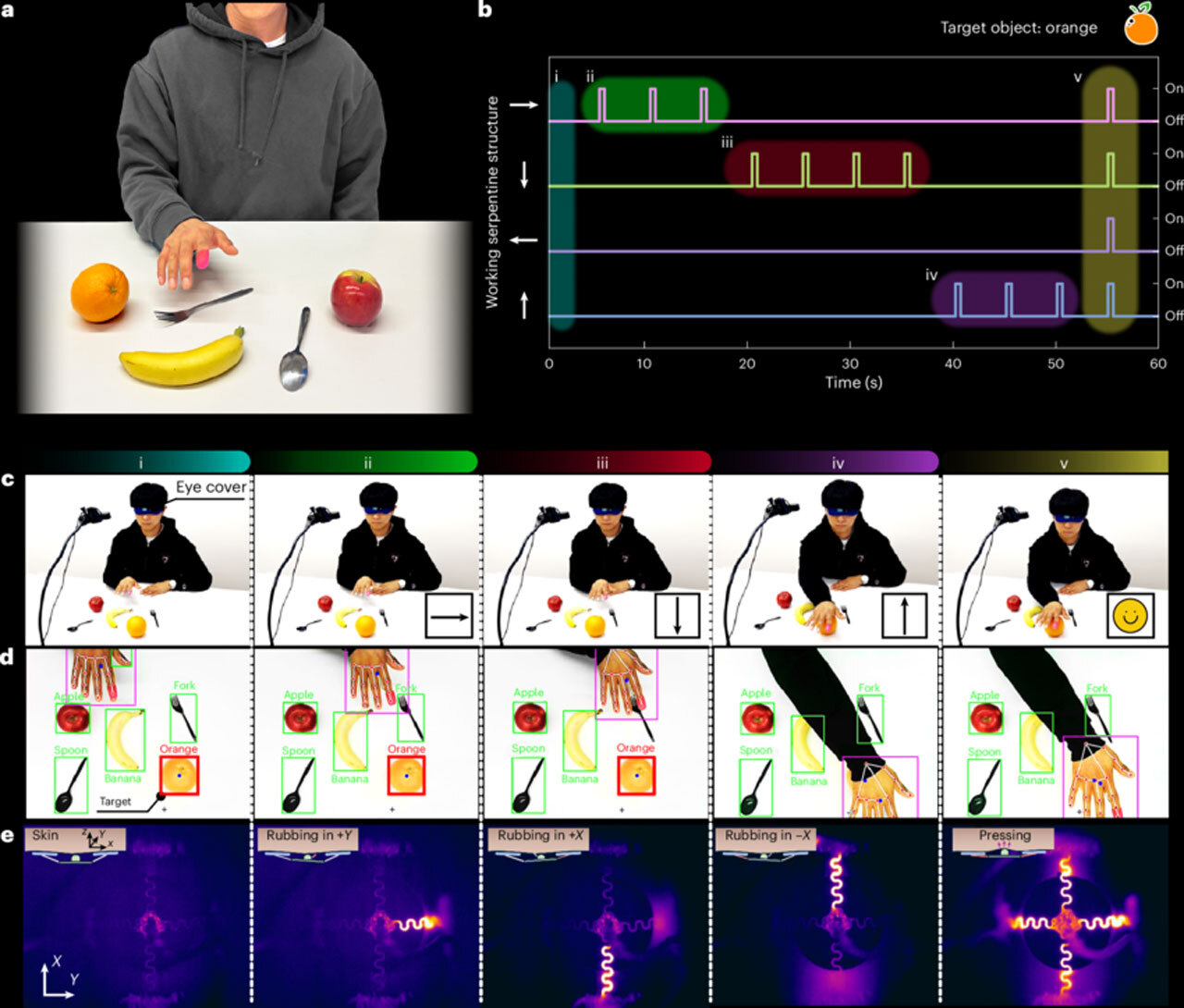 e) ИК-изображения, показывающие активацию тактильных устройств на основе рассчитанной информации о направлении.