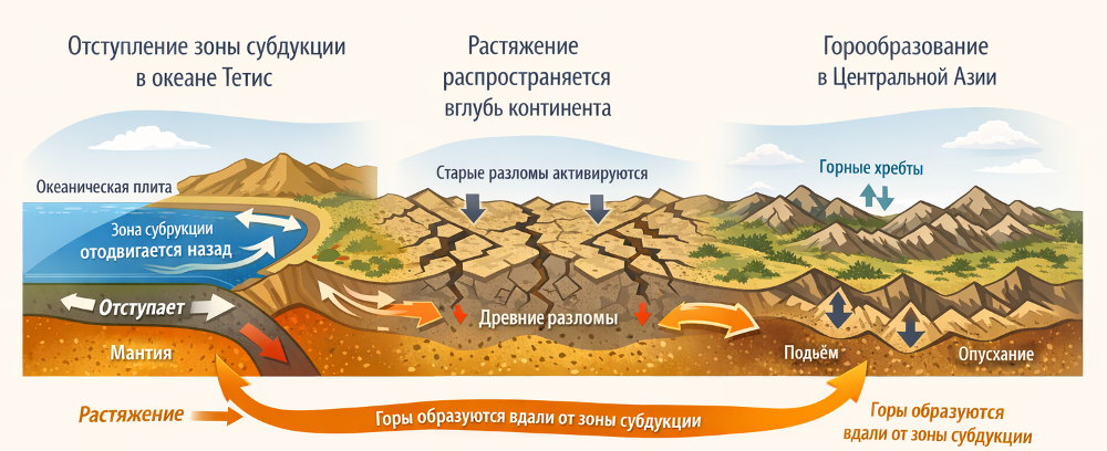Ученые предполагают, что растяжение океана Тетис, вызванное отступлением зон субдукции океанической коры, активировало древние разломы земной коры. Это привело к формированию системы примерно параллельных горных хребтов в Центральной Азии — на расстоянии до нескольких тысяч километров от будущей зоны столкновения Гималаев.