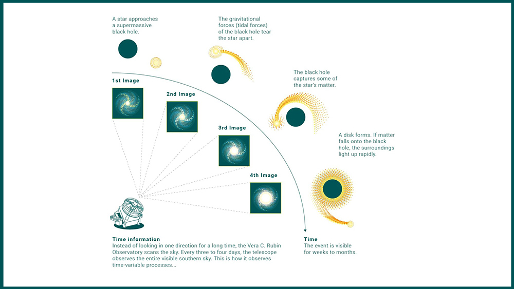 динамике Вселенной: телескопы вроде «Веры Рубин» фиксируют быстрые события, например, приливные разрушения — когда звезда разрывается черной дырой, вызывая яркие вспышки.