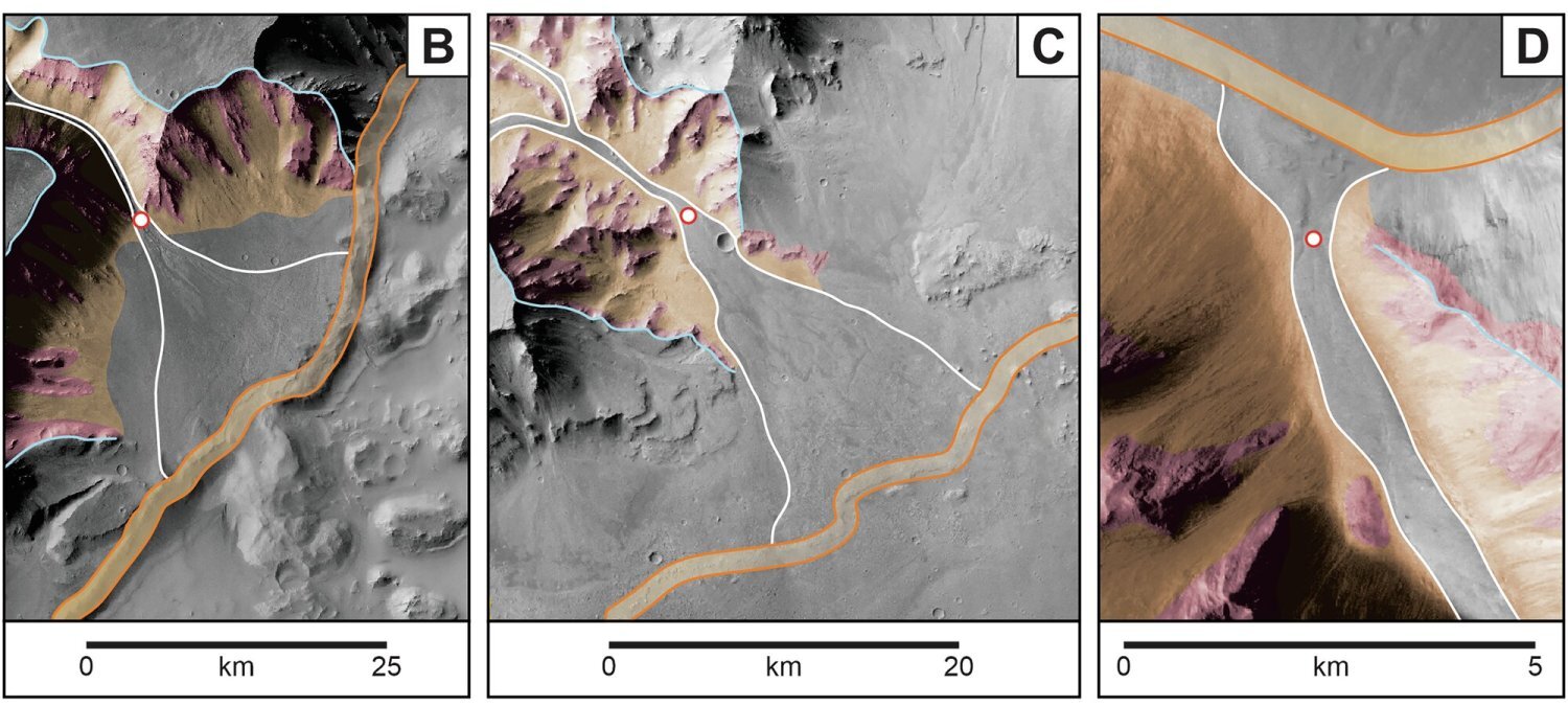 Там ученые выявили веерные дельты — осадочные структуры, формирующиеся при впадении рек в стоячий водоем. По форме и внутреннему строению они практически идентичны классическим дельтам на Земле. По словам первого автора работы Игнатиуса Аргадестьи, детальное картирование позволило уверенно интерпретировать эти образования как устья древних марсианских рек.