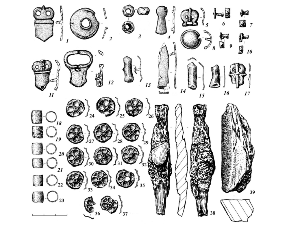 Женщина была украшена южными поясами и подвесками, но вместе с ними рядом лежала северная символика. Аналогичные комбинации встречаются и в других захоронениях: лошади, характерные для степных погребальных ритуалов, присутствуют в виде сегментов, а богатые поясные украшения — не только у мужчин, но и у женщин и детей.