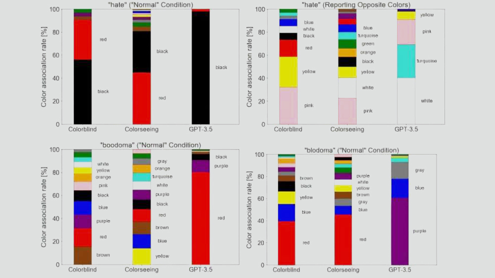 Исследователи провели масштабные онлайн-опросы, сравнивая четыре категории участников: взрослых с нормальным зрением, дальтоников, художников, регулярно работающих с цветами, и ChatGPT. Каждой группе было предложено сопоставить цвета с абстрактными словами, такими как «физика». Их попросили также расшифровать знакомые цветовые метафоры («они были в красной тревоге») и незнакомые («это была очень розовая вечеринка»), а затем объяснить свои рассуждения.