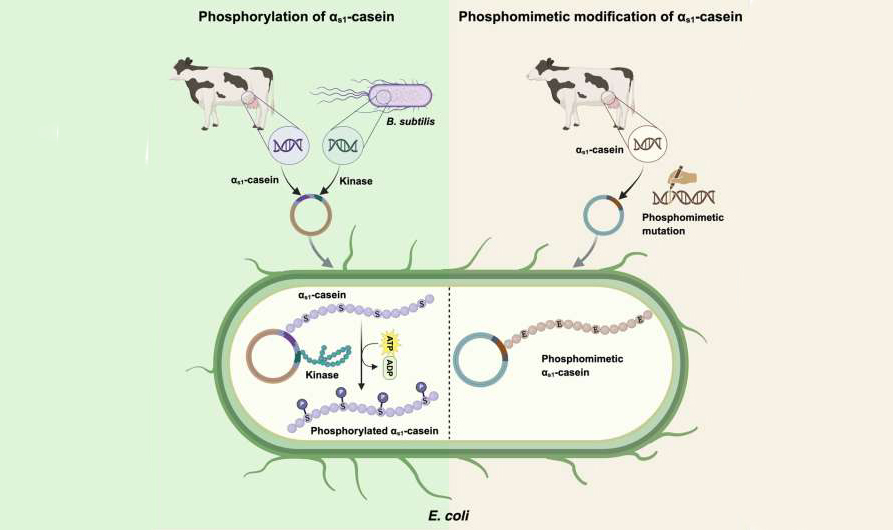 Чтобы решить эту проблему, исследователи применили две основные стратегии. Во-первых, подсадили в E. coli гены экспрессии трех протеинкиназ из сенной палочки. Во-вторых, вместо серина использовали аспаргин, результатом чего стал αs1-казеин — фосфомиметическая версия коровьего белка.