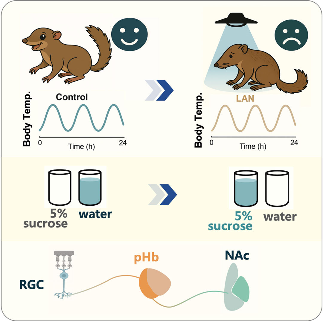 На протяжении трех недель малайских тупай Tupaia belangeri chinensis освещали синим светом по два часа каждую ночь. В результате у них стали проявляться симптомы, схожие с депрессией, включая 20%-ное снижение предпочтения сахарозы (маркер ангедонии), уменьшение исследовательского поведения и ухудшение долговременной памяти.