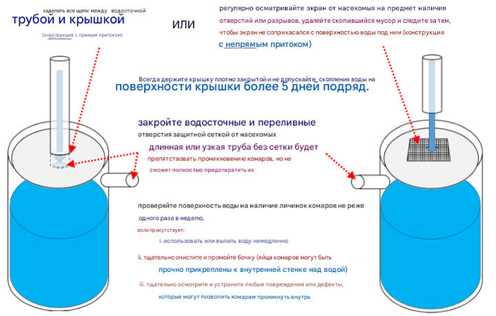 Кроме того, они посоветовали очищать емкости для сбора воды от органического материала (листьев, веток и т. п.), обрабатывать их инсектицидом или хлором. Те, кто опасается химикатов, могут заселить в бочку хищников личинок комаров — например, золотых рыбок.