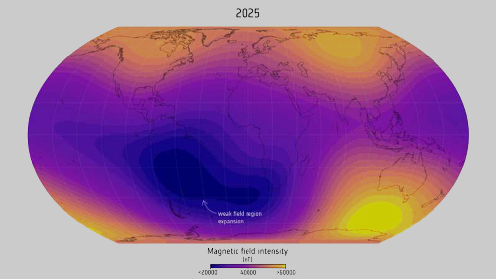 Последние результаты миссии Swarm, опубликованные в журнале Physics of the Earth and Planetary Interiors, показывают, что с 2014 по 2025 год Южно-Атлантическая аномалия неуклонно расширяется, а особенно быстрое ослабление магнитного поля зафиксировано в точке к юго-западу от Африки с 2020 года.