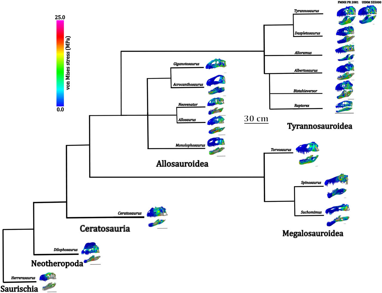 После 3D-сканирования поверхностей черепов исследователи изучили механику укуса динозавров, используя метод моделирования нагрузок в мостах. Сравнив крепление мышц к костям черепа у каждого динозавра с современными родственниками — птицами и крокодилами, — они обнаружили, что у гиганотозавра и спинозавра укус был значительно слабее, чем у эволюционно более позднего тираннозавра, короткий и массивный череп которого позволял развивать огромное давление в челюстях.