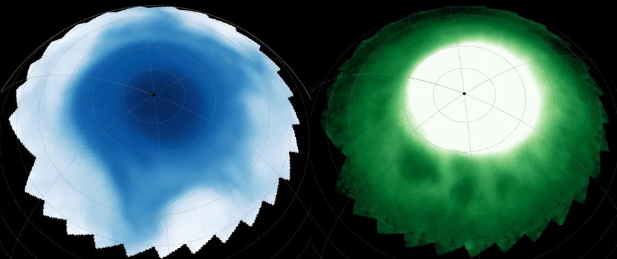 В слоях атмосферы над вихрем астрономы ожидали увидеть излучение в широких диапазонах инфракрасного спектра. Однако вместо этого они заметили темные, похожие на бусины, структуры с большими промежутками между ними, которые, возможно, взаимосвязаны. Эти структуры медленно дрейфуют в заряженной плазме ионосферы планеты, а под ними в стратосфере расположена несимметричная звездообразная структура. Свои выводы они опубликовали в журнале Geophysical Research Letters.