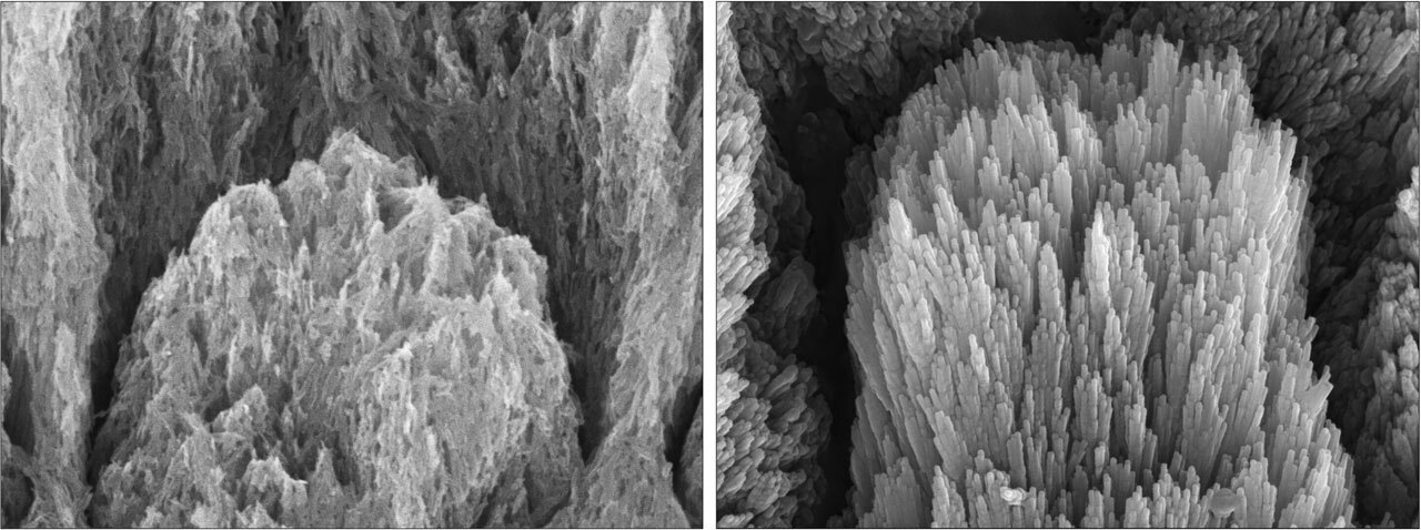 Такая ориентация означает, что новый слой толщиной до 10 микрометров интегрируется в лежащую ниже естественную ткань, восстанавливая структуру и свойства эмали.