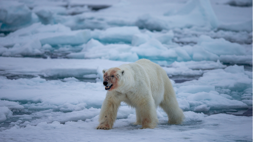 Белые медведи (Ursus maritimus), приспособленные прятаться на морском льду, будут особенно уязвимы, если исчезнет лед. Быстрое изменение экосистемы может привести к их полному вымиранию или к их скрещиванию с медведями гризли (Ursus arctos horribilis), ареалы которых расширяются на север по мере потепления климата. В конечном итоге белые медведи заменятся гибридными.