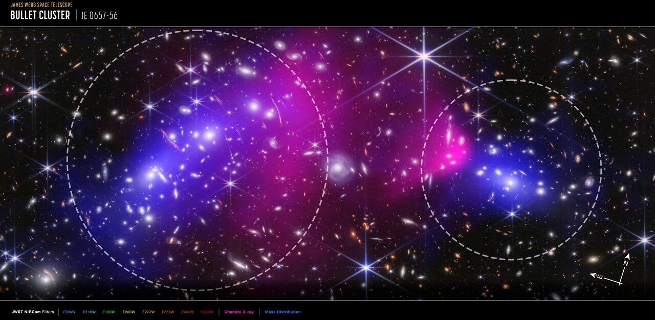 Новая карта скопления Пули представлена на новом изображении: поверх изображения с «Уэбба» (камера ближнего инфракрасного диапазона) наложены данные от рентгеновской обсерватории «Чандра», которые показывают горячий газ в розовом цвете, в том числе — справа в форме пули. Уточненное недавно с помощью «Уэбба» распределение темной материи, показано синим. Галактические кластеры находятся в пределах пунктирных кругов.