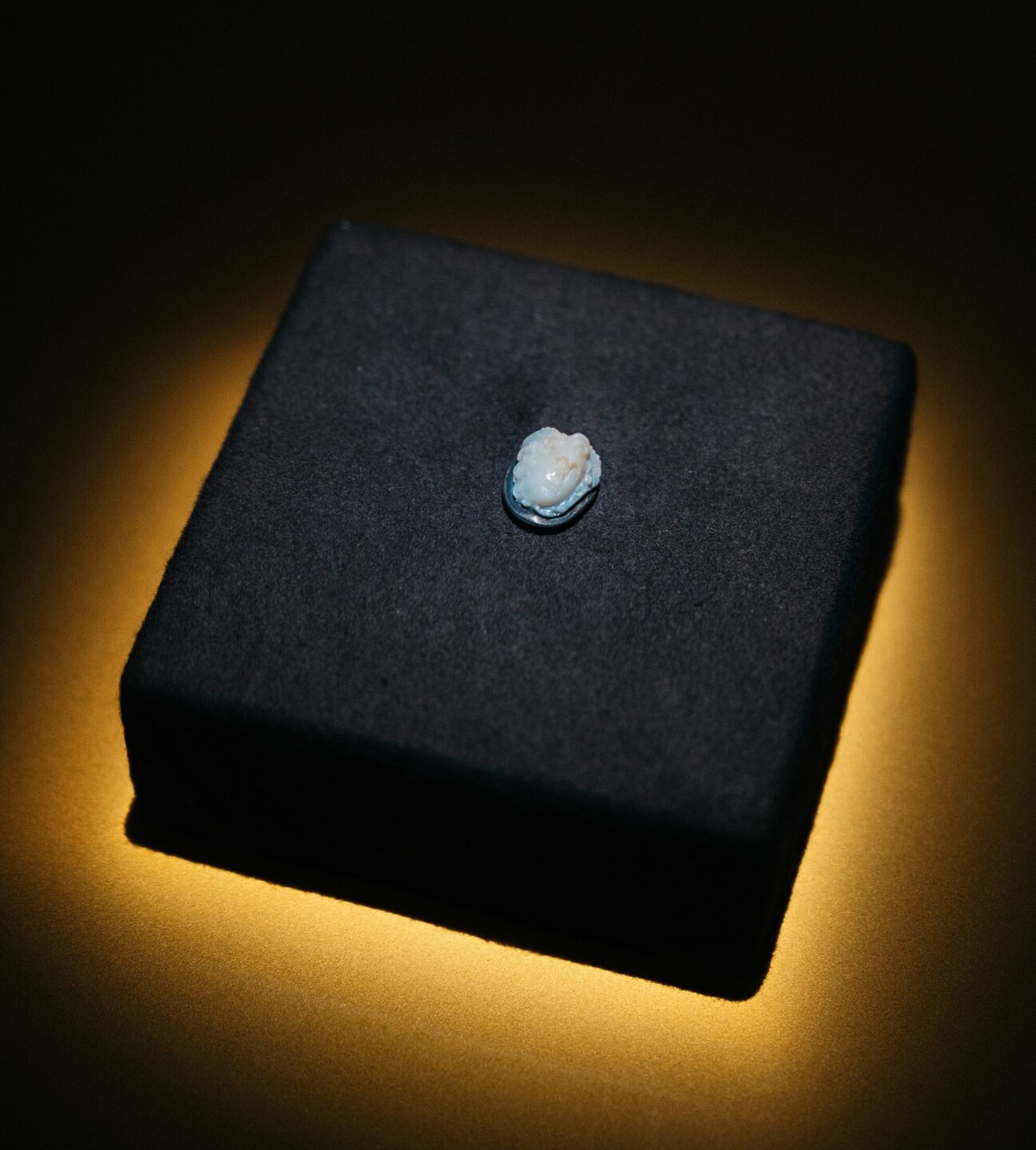 Камень выполнен из черно-белого полосчатого агата, или оникса, и, по всей вероятности, был изготовлен в Аквилее — крупном римском культурном и торговом центре на севере Адриатического моря. Археологи из считают, что когда-то он украшал ожерелье богатой римлянки, жившей почти 1900 лет назад.
