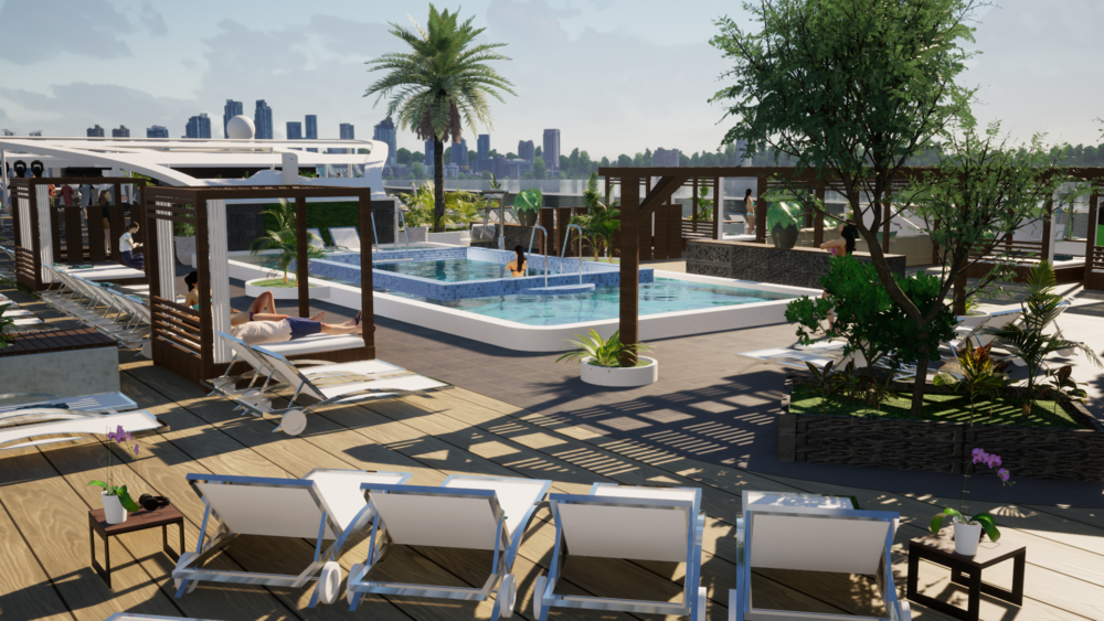 Концепт впечатляет масштабом. Длина судна составляет около 275 метров, валовая вместимость — примерно 82 000 тонн. На борту смогут размещаться до 1856 пассажиров.