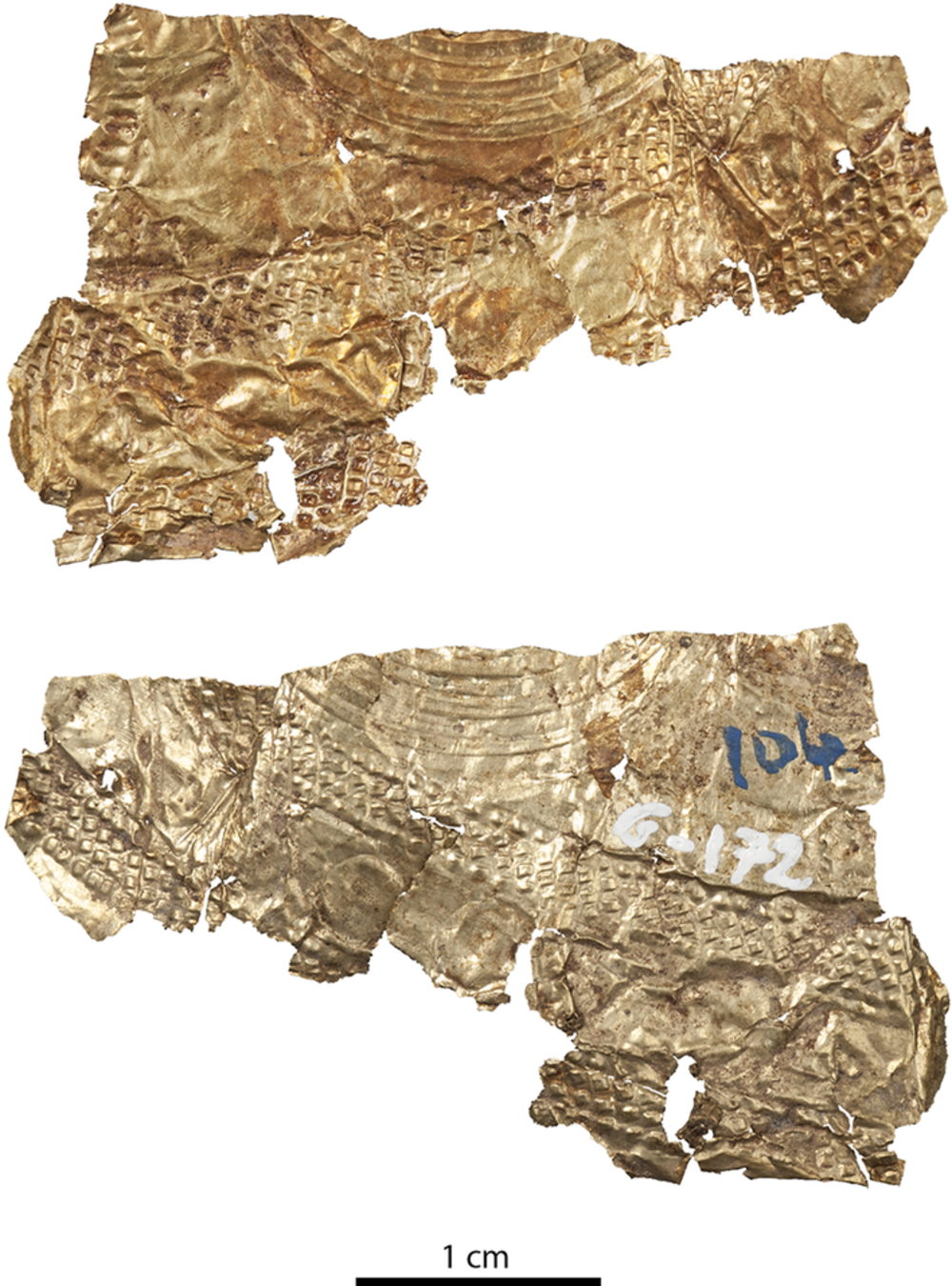 Первое украшение, найденное в Мазаракате, — фрагмент золотого диска диаметром около 12 сантиметров с рельефными концентрическими кругами. Такие мотивы практически не встречаются в обычном микенском искусстве.