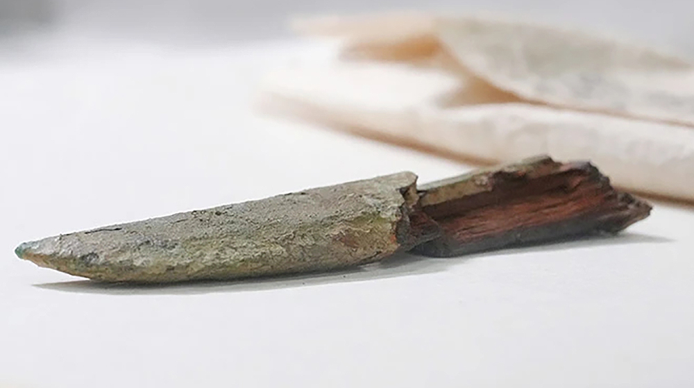 Среди находок — позолоченный церемониальный нож и три фрагмента доспехов. Нож имеет железное лезвие в ножнах из японского кипариса, обложенное тонкой позолоченной медной пластиной и закрепленное пятью серебряными заклепками. Археологи отмечают, что подобных маленьких позолоченных ножей из погребений V века до этого не находили.