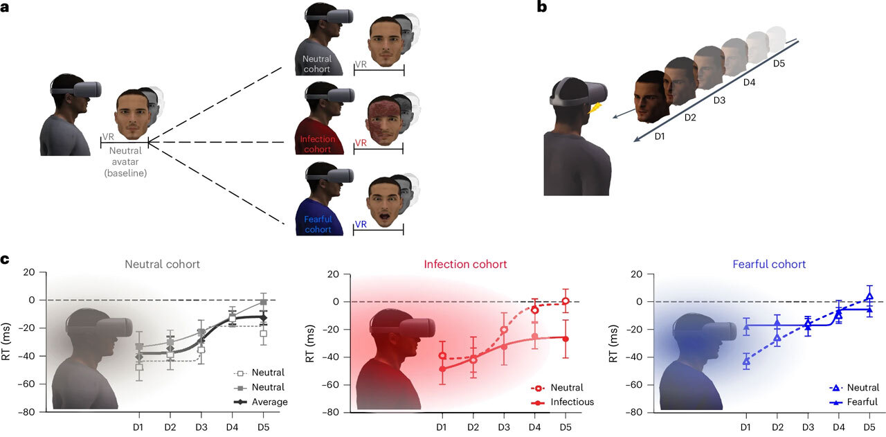 Результаты ЭЭГ-тестов, исследующих электрическую активность мозга, подтвердили эти выводы. Как и ожидалось, по мере приближения аватаров активируется система мозга, отвечающая за личное пространство. Однако эта активация отличается при виде признаков инфекции — даже если они далеко. Эти различия локализуются в областях мозга, связанных с обнаружением и фильтрацией угроз.