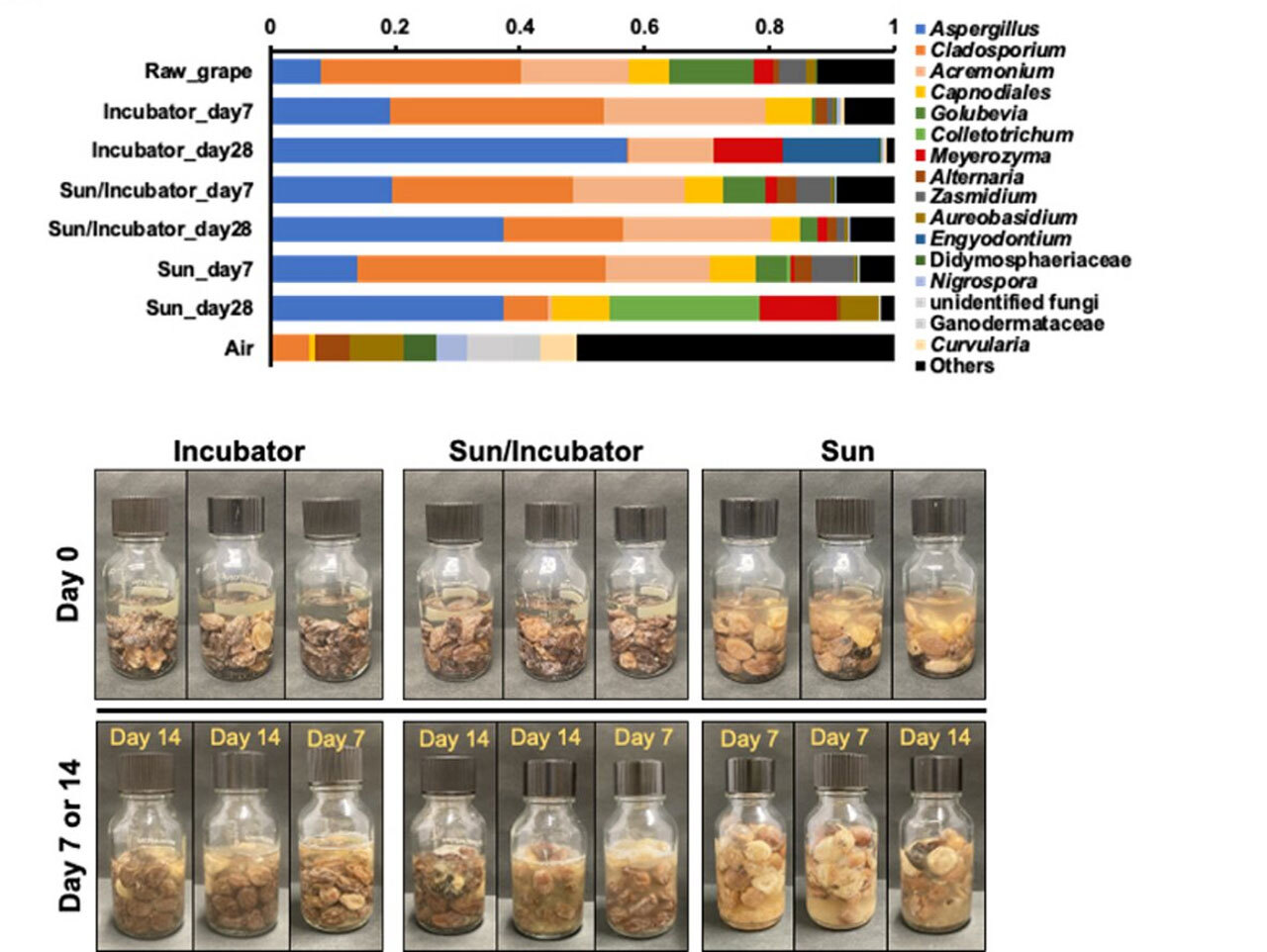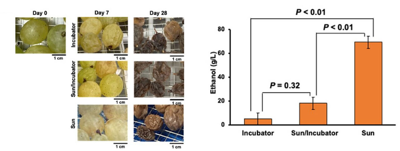 Чтобы проверить эту теорию, команда собрала свежий виноград и высушивала его в течение 28 дней тремя способами: в инкубаторе, на открытом солнце и комбинированным методом (инкубатор + солнце). Затем полученный изюм поместили в воду в бутылках и выдерживали при комнатной температуре две недели, подготовив по три образца для каждого типа сушки.