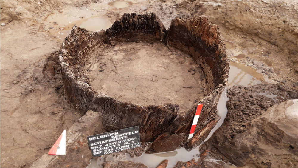 В завершении раскопок археологи наткнулись на еще один сюрприз — глубокую шахту, ранее принятую за скотный водоем. На деле это оказался древний колодец, сооруженный из трех крупных выдолбленных стволов деревьев. Внутри сохранились редкие органические материалы: кожаные фрагменты, куски дерева и даже легкое крылышко насекомого — уникальная сохранность для объекта такого возраста.