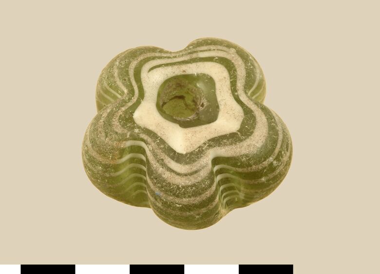 В этом же слое нашли три стеклянные бусины: крупную зеленую (диаметром 3,8 см с белыми нитями внутри) и две меньшие — синюю и прозрачную. Хотя по стилю большая бусина относится к I веку н.э., археологический контекст говорит о том, что она была положена в землю примерно в IV веке, в период Великого переселения народов.