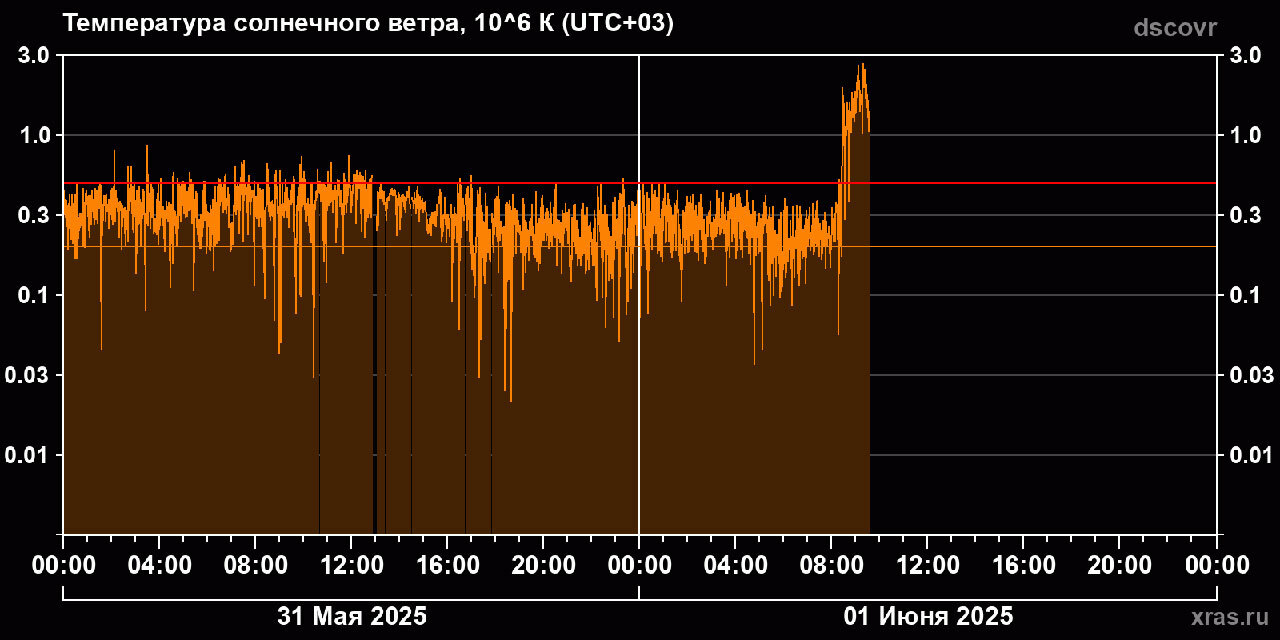 Резкий скачок всех параметров межпланетной среды зафиксирован 1 июня в 08:30 по московскому времени. Скорость солнечного ветра превышает временами 1000 км/с, его температура — свыше двух миллионов градусов при нормальных значениях около 100 тысяч, то есть горячее даже, чем плазма в короне нашего светила. Такие значения никогда не регистрировались в истории наблюдений, либо близки к историческим максимумам.
