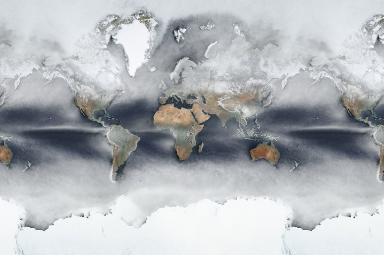 Более привычная равнопромежуточная проекция рисует не столь печальную картину вселенского холода. Стоит обратить внимание, что при расчете средних значений пикселей белым окрашивались не только заснеженные места, но и районы с преобладающей облачностью. Облака рисуют кайму вдоль побережья Центральной и Южной Америки, Центральной Африки и островов Малайского архипелага.